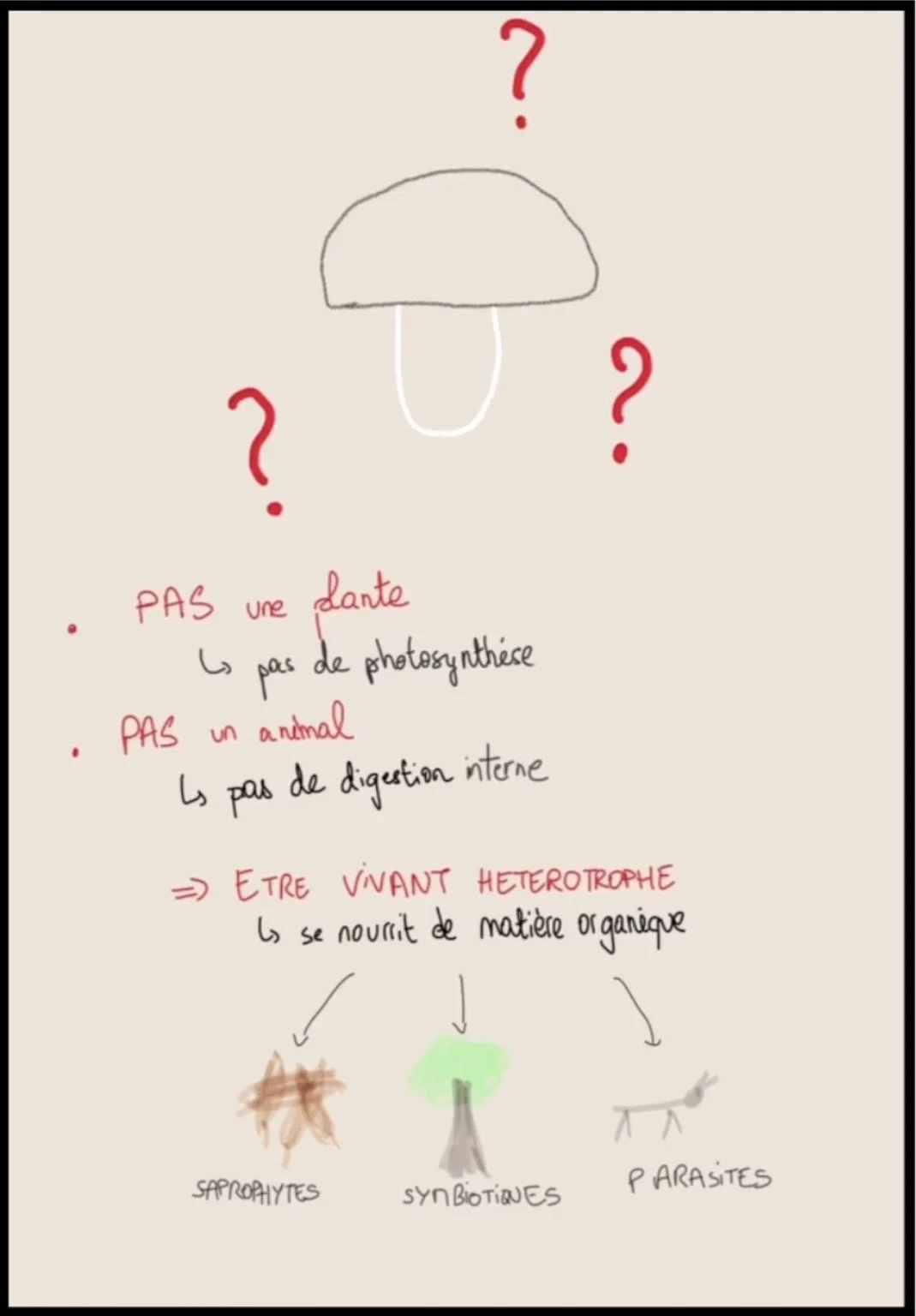 Le champignon n’est pas une plante parce qu’il n’y a pas de photosynthèse, ni un animal puisqu’il n’y a pas de digestion interne.