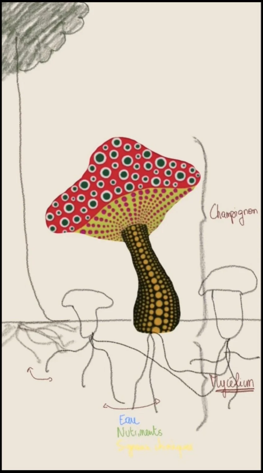 En japonais, le champignon se dit « Kinoko ». Cela signifie l’enfant de l’arbre. Ce n’est pas un hasard ! Le champignon échange principalement des informations avec les arbres et le mycélium peut s’accrocher aux racines pour se nourrir.